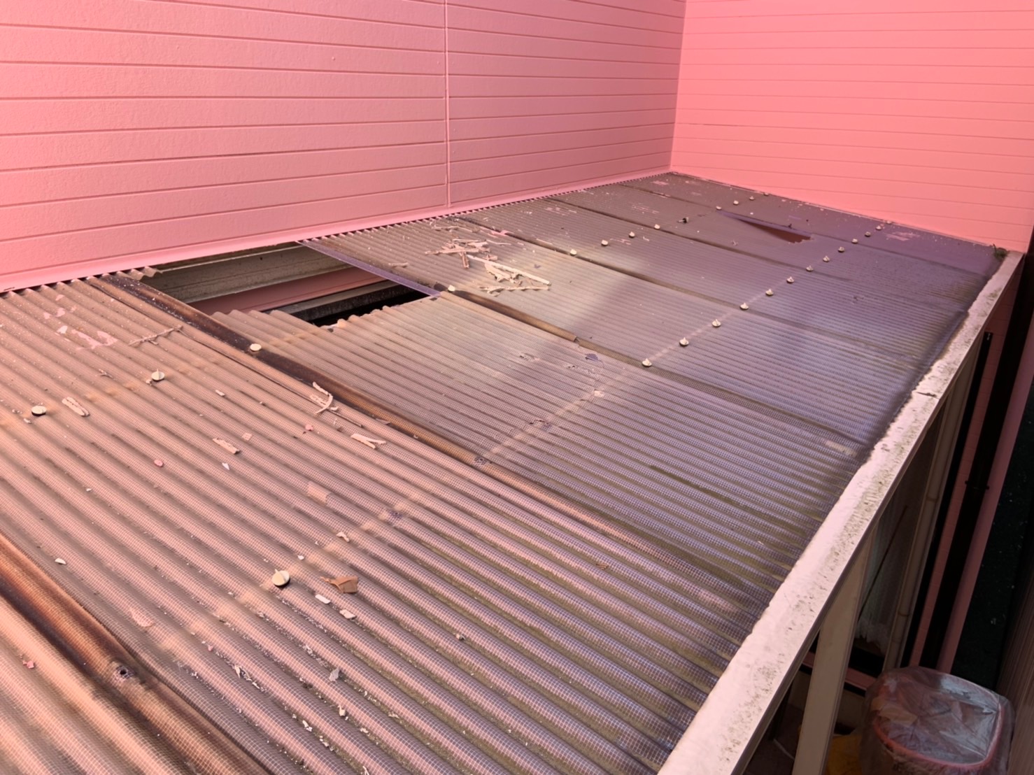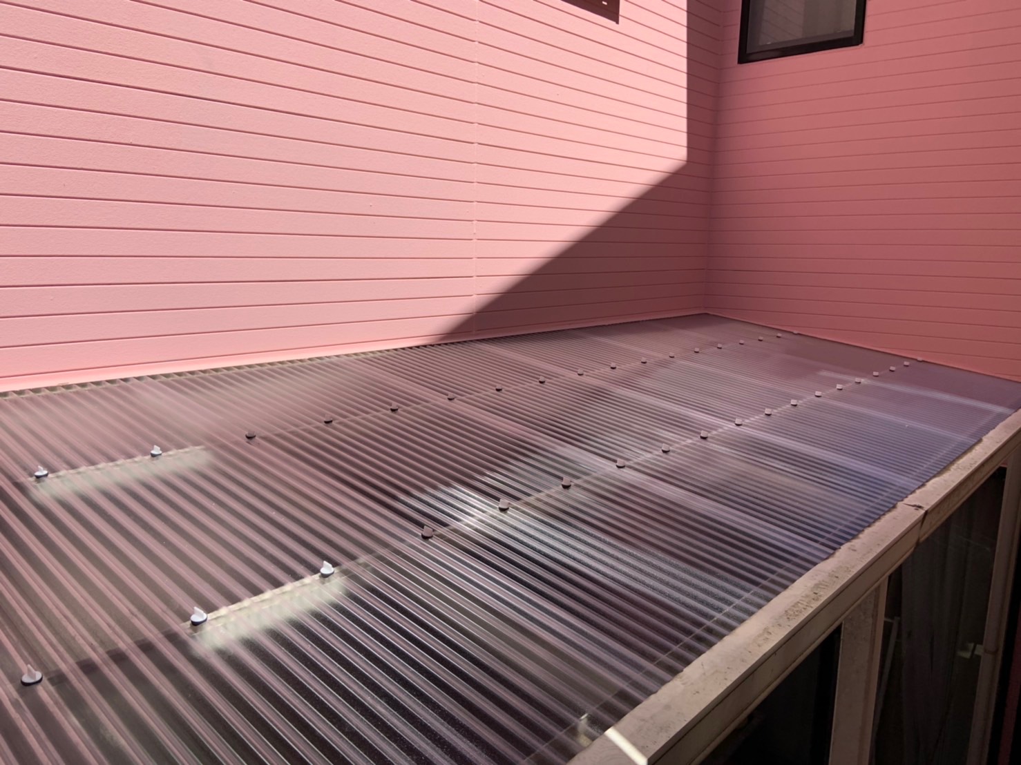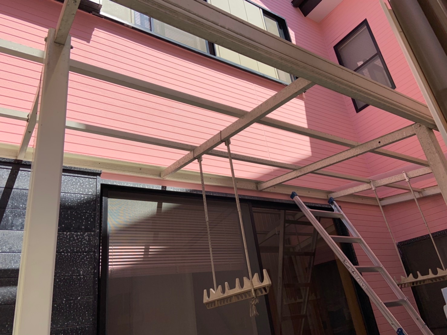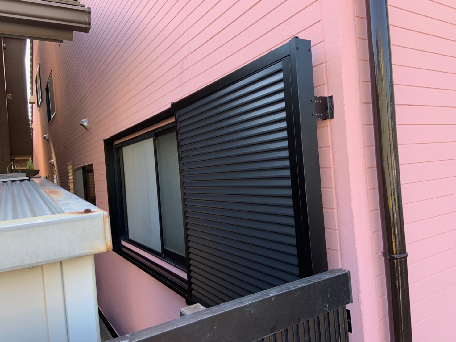 ガイナでの塗装になります。お色を一新し、明るい外壁に塗り替えです。 樋、雨戸などの付帯物が塗り替えられ、外壁のピンクとのコントラストが映えて より一層綺麗なお家になりました。 今回、塗装の他に雨戸を新規で取り付ける工事、波板の補修も行いました。