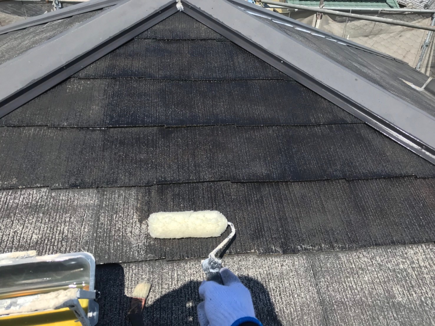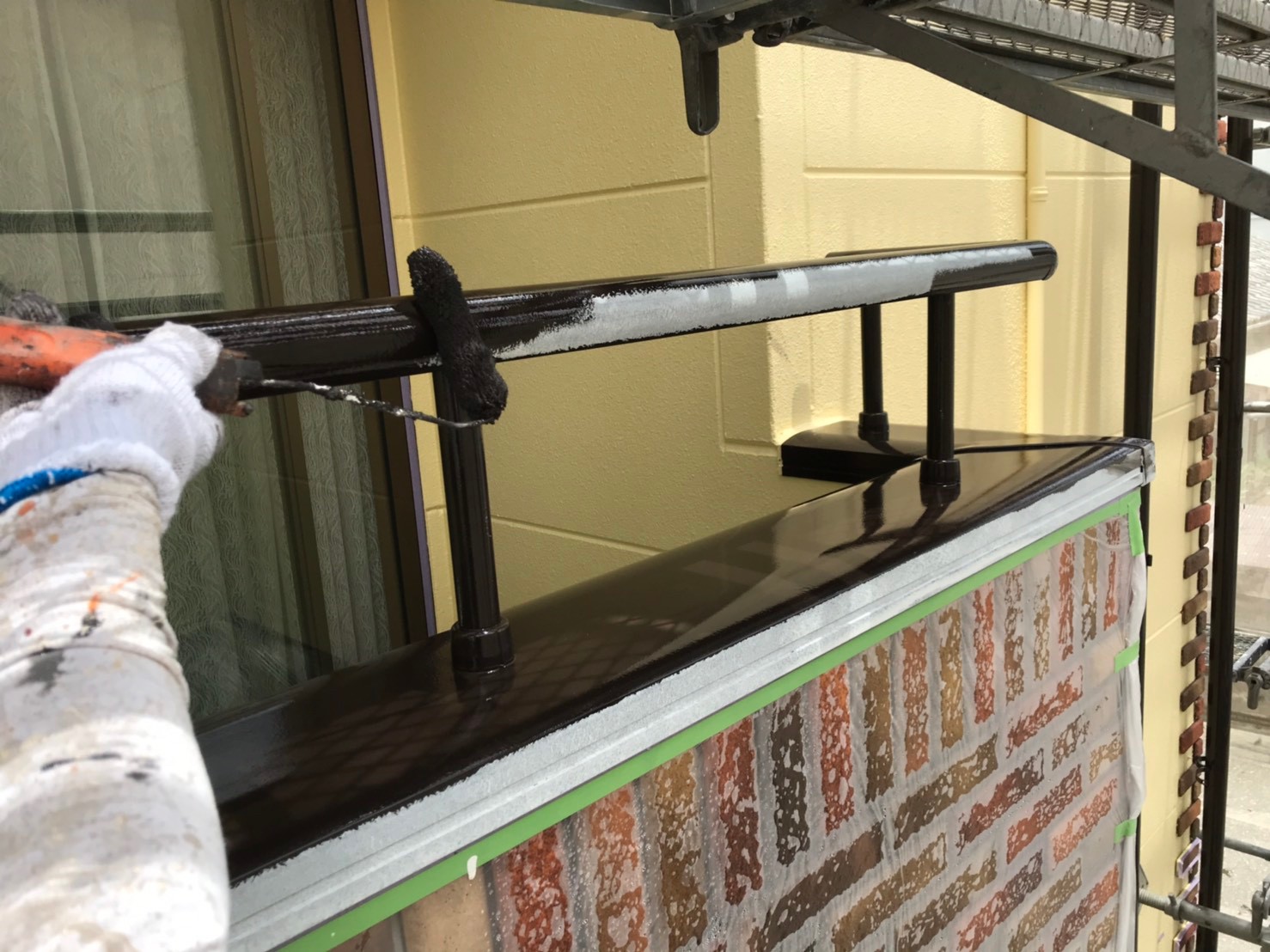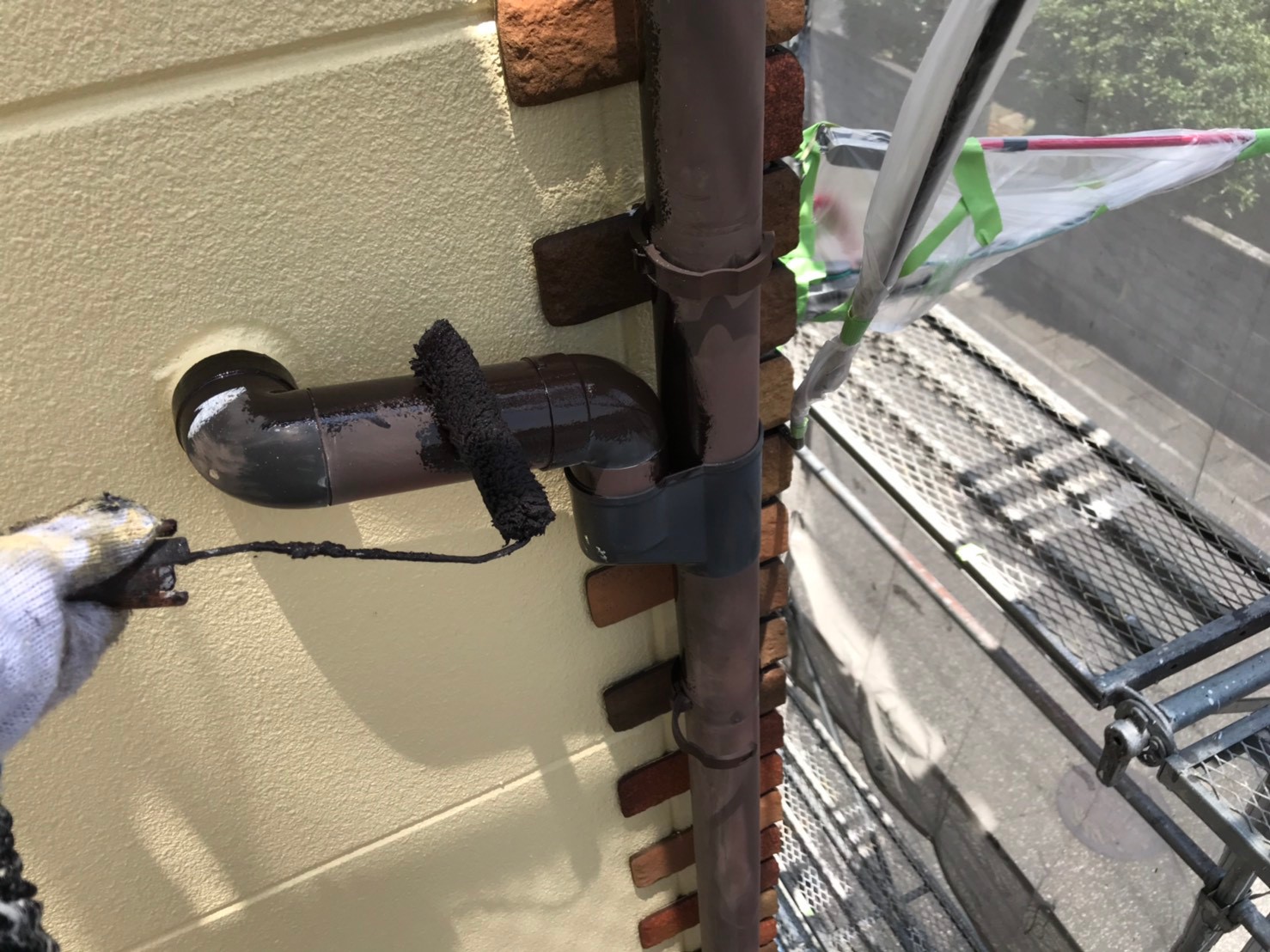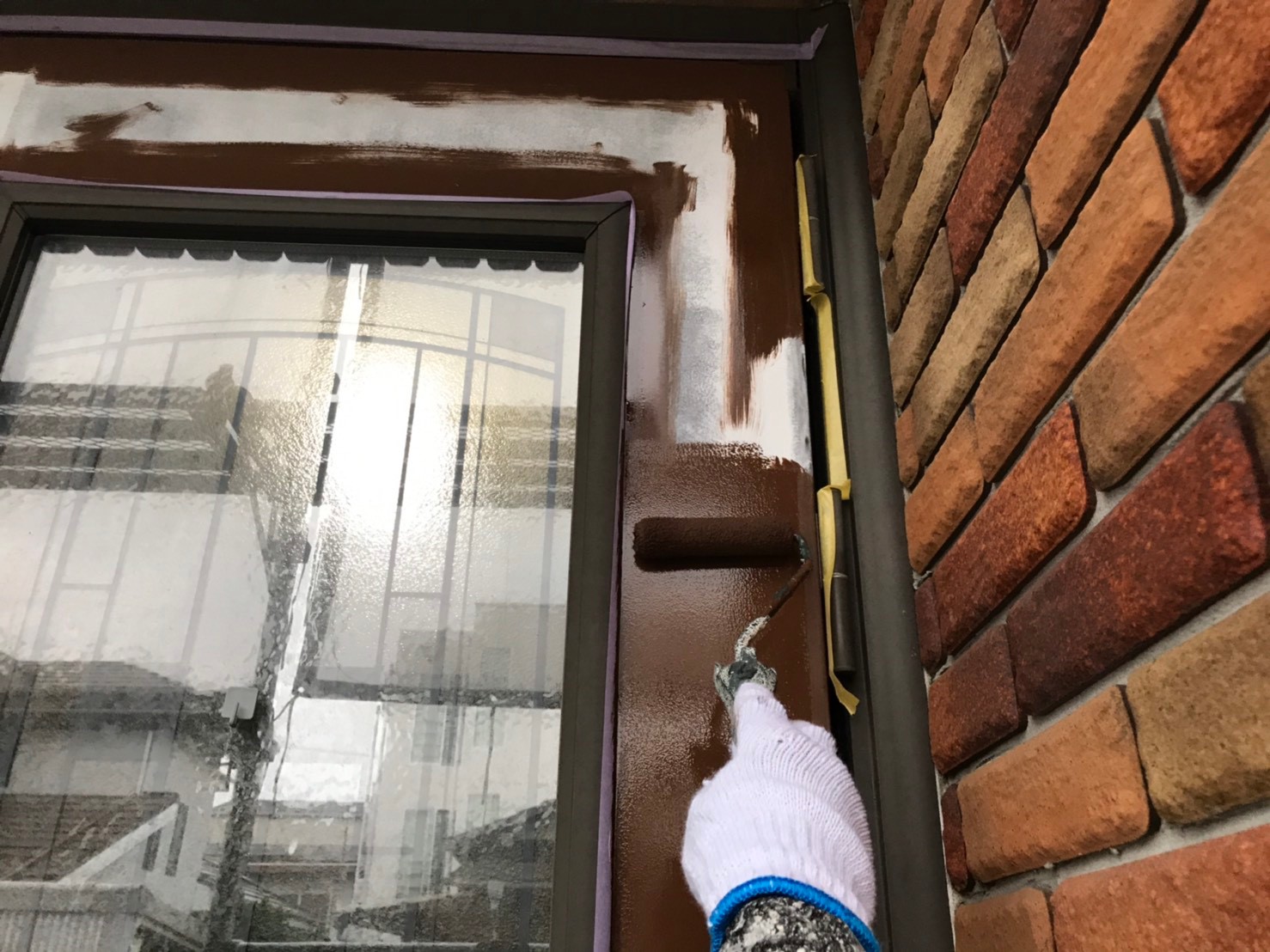 色褪せの目立つ屋根が、モスグリーンのお洒落な色に塗り替えられました。見えない部分ではありますが、 紫外線の影響を一番受けやすい屋根こそメンテナンスが重要になります。今回使用しました塗料、日本ペイントのファインパーフェクトベストは、シリコンを超えた耐久性を持ち、防藻、防カビ効果も優れた塗料になります。 外壁はレンガとの調和が取れた水性塗料のベージュ系カラーでの塗り替えでした。
